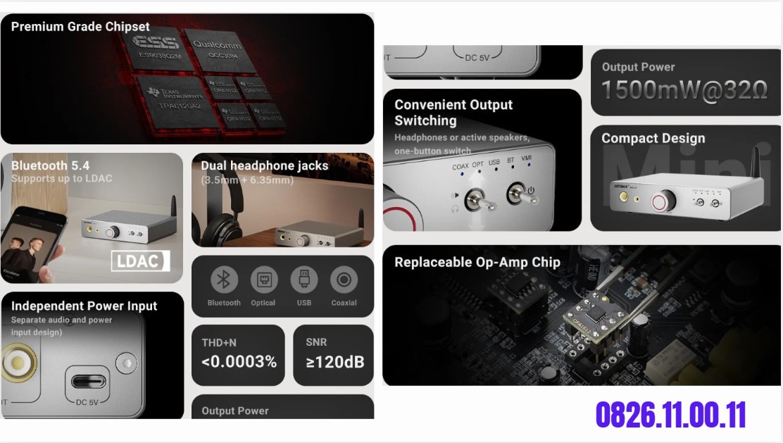 | Bộ vi mạch | ES9038Q2M + OPA1612*4 + OPA2604*1 + TPA6120A2*1 (Tai) AmpChip khuếch đại) + QCC3084 (Bluetooth) |